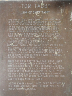 It was during the Black Hawk War of the mid-1860s that Tom Tabby died accidentally while hunting. Chief Tabby, whose people had once freely roamed the Provo River Valley, in which Heber City is located, carried his dead son in his arms to the town hoping that the boy could be buried there. Joseph Stacy Murdock consented to conduct a Christian burial service. According to a plaque at the cemetery, following the funeral Tabby said, “My son has been buried in the white man’s custom, now he will be honored in the Indian fashion.” The Indians laid cedar logs on the grave, led the boy’s favorite pony to the logs where it was killed, then ignited the funeral pyre. When the blaze had died to embers, the saddened chief mounted his horse and with his companions rode east, to the reservation. Chief Tabby, the seeker of peace between the Native American and the settlers, had demonstrated his commitment to seek the best of both worlds rather than fight.
